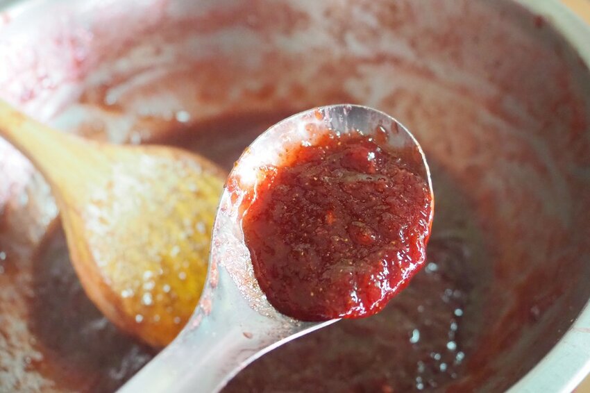 等到湯汁蓋過草莓之後用湯瓢來將果實切碎