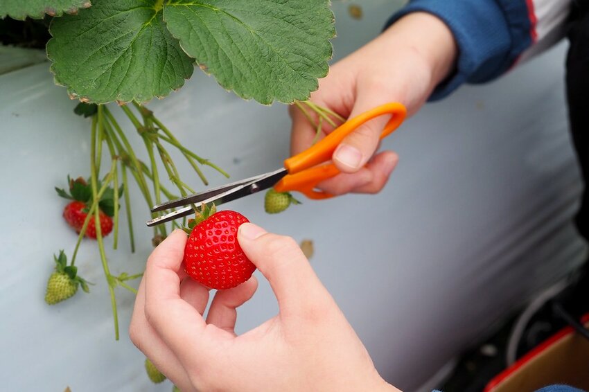 草莓採摘的方式為一手拿著草莓的果梗,一手用剪刀把果梗剪斷放入紙箱中