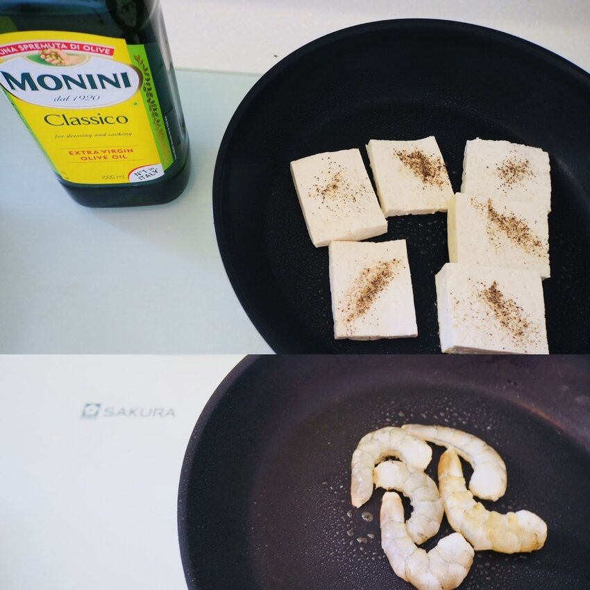 食材:蝦仁、蕃茄、板豆腐、MONINI初榨橄欖油、巴薩米克醋、鹽巴、黑胡椒