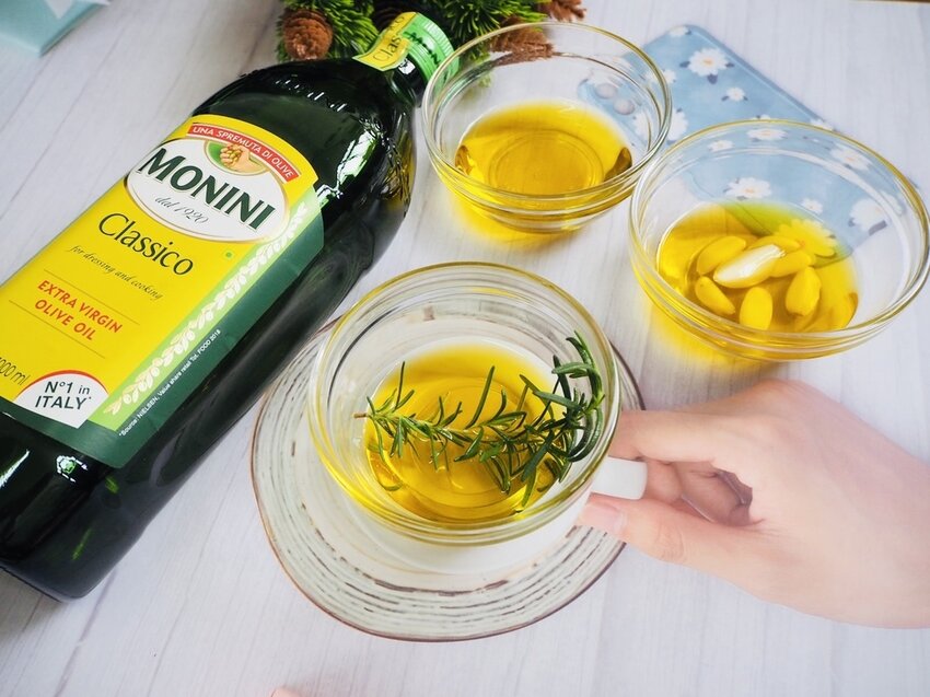 最近養了一盆迷迭香,也把橄欖油加入了迷迭香,拿來煮義大利麵或是煎牛排都很適合。