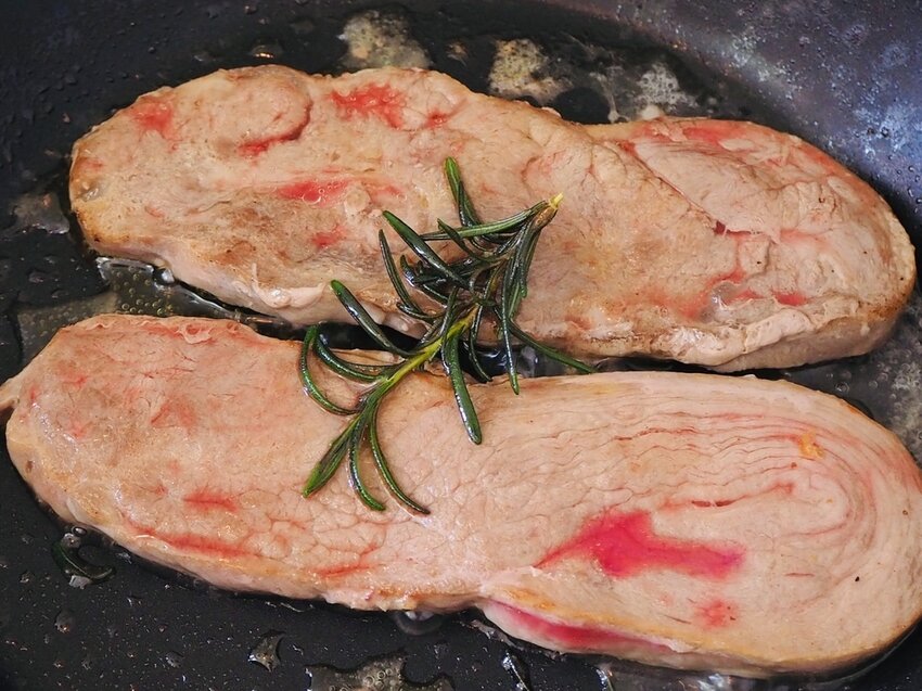 1.平底鍋放入迷迭香橄欖油將牛排煎至5分熟後放置回溫,並灑上海鹽或是胡椒鹽,即可享受美味牛排