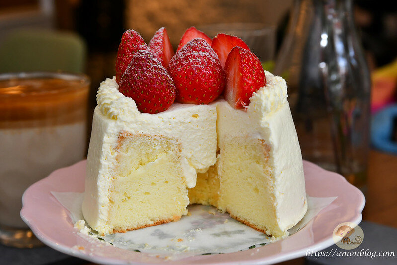 來之前看其他網友介紹說店內有賣戚風蛋糕,但現場看發現口味不太一樣,應該是因為冬天關係,所以就是草莓戚風口味的啦,蛋糕上滿滿草莓都是用台灣產的草莓喔,吃起來酸酸甜甜很迷人,這季節吃草莓最對味,戚風蛋糕外層有一層添加北海道煉乳的動物鮮奶油,奶香濃郁。因為我一直都不愛吃鮮奶油,本來想吃一口就好,但吃完後發現鮮奶油搭配日本鳥越麵粉製作的戚風蛋糕還蠻好吃,所以反而還多吃好幾口XDD。