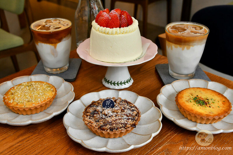 因為太久沒來了,所以這次就一口氣點了一堆,共有兩個鹹派、一個甜派、一個戚風蛋糕,外加三杯飲料,本來還想點檸檬塔和巴斯克蛋糕,但發現這樣可能會吃不完,所以就留給下次再吃。
