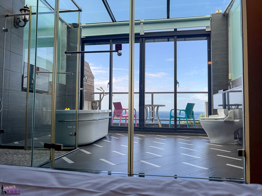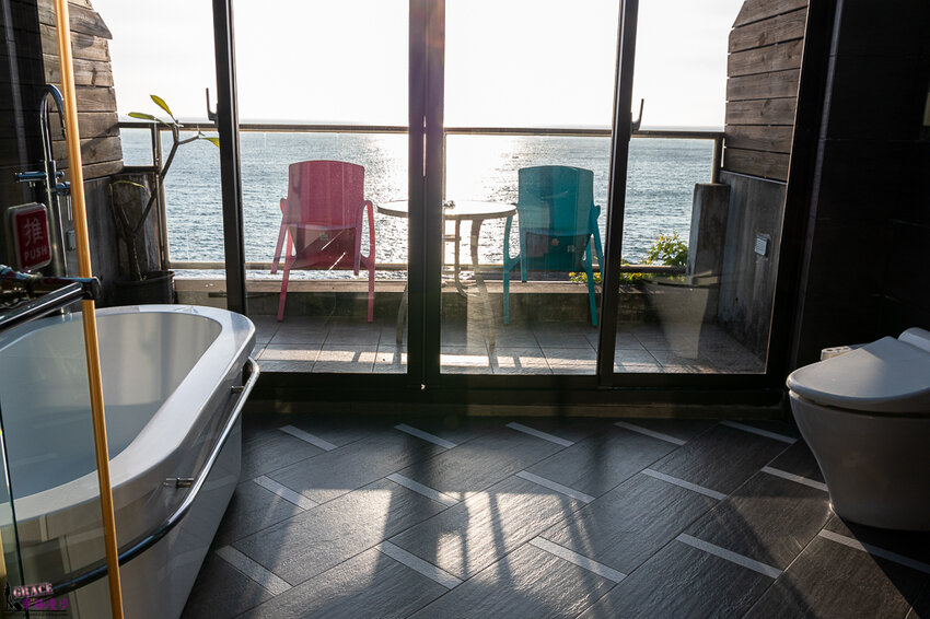前往陽台處就是衛浴空間了,這裡可以說是整個房型的賣點,當陽光灑落時相當漂亮,而且可以邊泡澡邊欣賞海景喔!