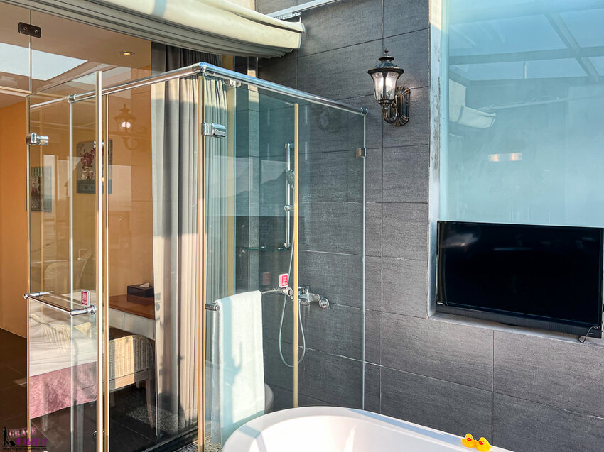 衛浴空間上方是透明的玻璃天窗,整個光線很充足,我笑說在房間就可以享受日光浴了,如果不想曬太陽或要有點隱密性都有電動門簾可以拉上。