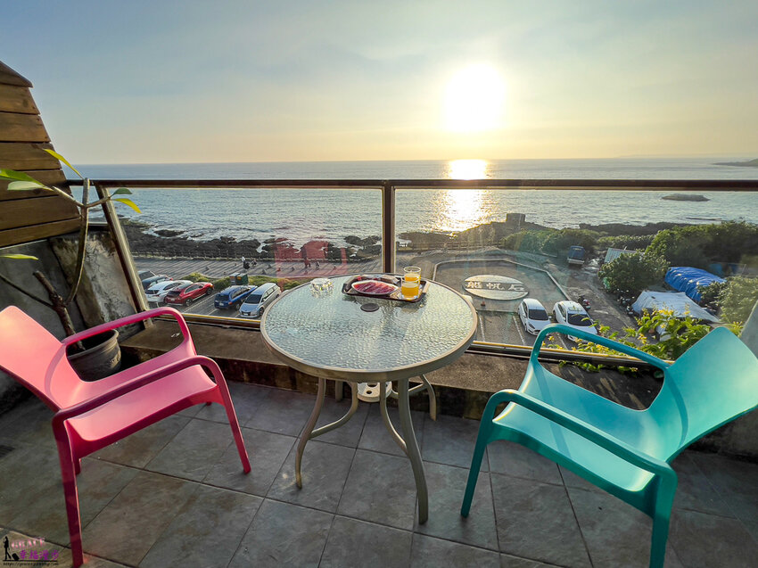 陽台的空間有擺放著桌椅,我們就把民宿準備的下午茶拿到陽台吃,看著夕陽海景吃著下午茶這也太幸福了。