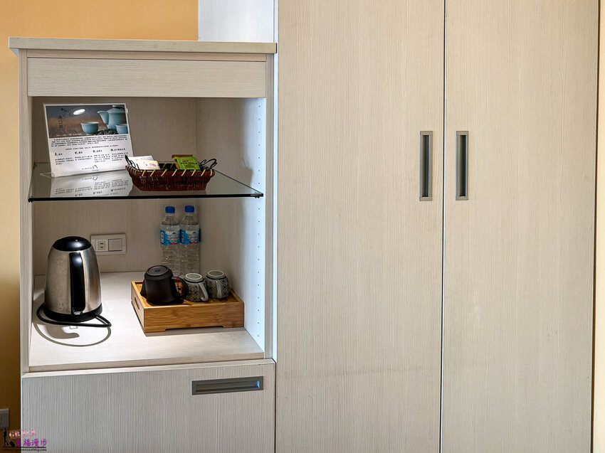 另一側有著衣櫃和mini吧,衣櫃裡面有準備睡衣,這是在一般的民宿比較少見的貼心配備,mini吧上有著茶包、餅乾、礦泉水、熱水壺等。