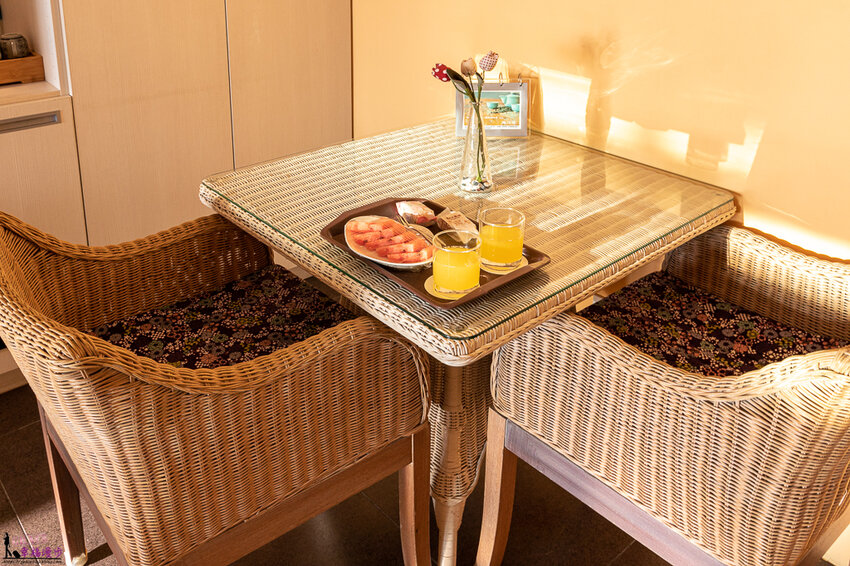 進到房間首先會看到籐製小餐桌椅,桌上到的水果點心都是等旅客到店時才準備拿上來的。