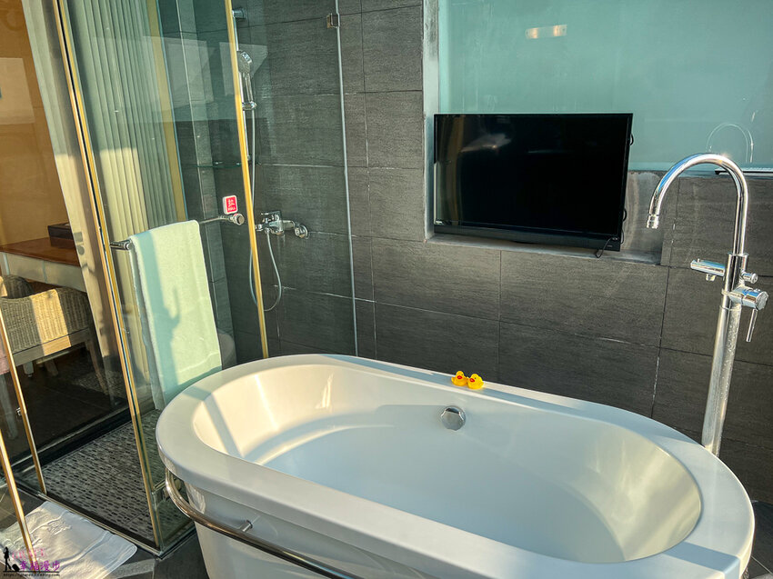 衛浴的空間有著淋浴間和浴缸,淋浴間也備有電視耶!邊泡澡邊看電視也太享受了。