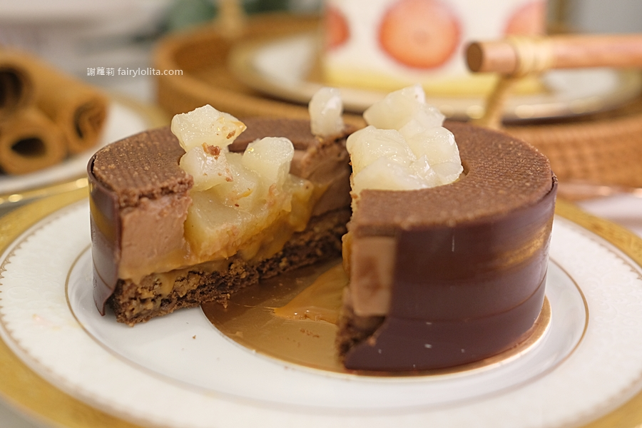 中間圈著洋梨糖漬、洋梨醬,而蛋糕體圍著一圈則是巧克力脆片,其它還有洋梨吉瓦納塔及可可餅乾,在眾多蛋糕中也許它並不是長得特別亮眼的,但卻給我一種層次很多的感覺。