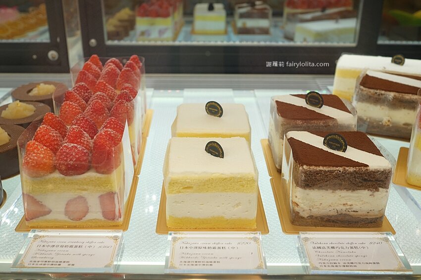 除了一看就讓人眼睛移不開的「日本中澤草莓奶霜蛋糕」之外,旁邊則是人氣也很高的「日本中澤原味奶霜蛋糕」及「法國法芙娜巧克力蛋糕」。