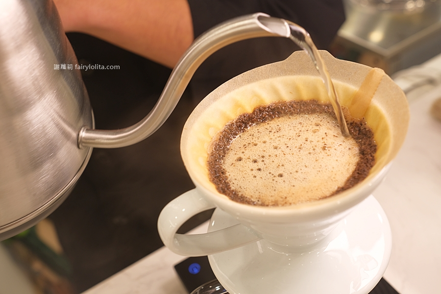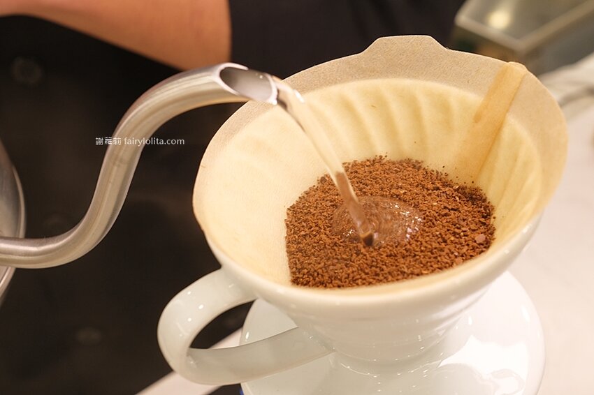 等咖啡豆磨好之後,就會開始手沖,光是站在旁邊,你就可以聞到它那撲鼻的香氣。