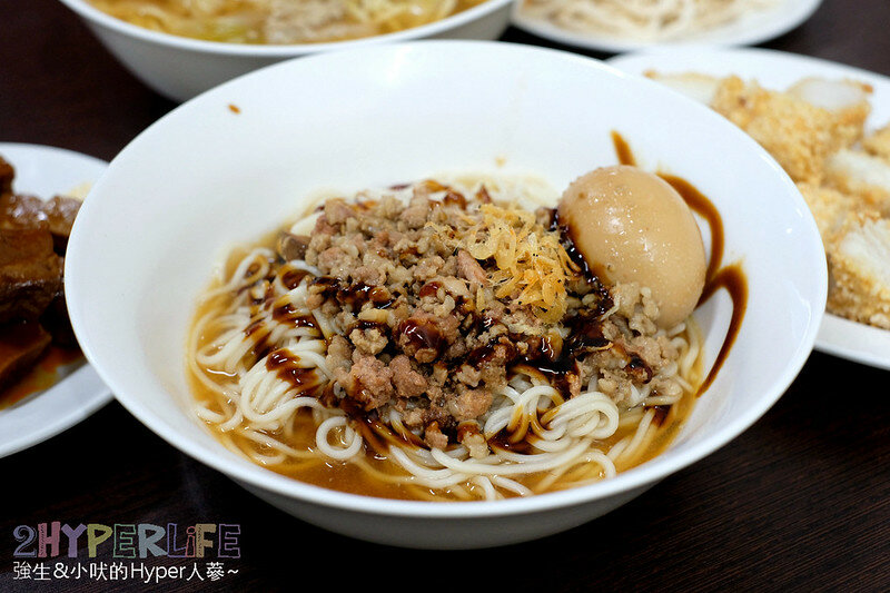 肉燥還蠻香的,還附了一顆滷蛋, 醬汁的部分有甜甜鹹鹹的感覺, 比較重口味。這道麵條搭配的是細的白麵條,上面還有一些蝦米非常提味