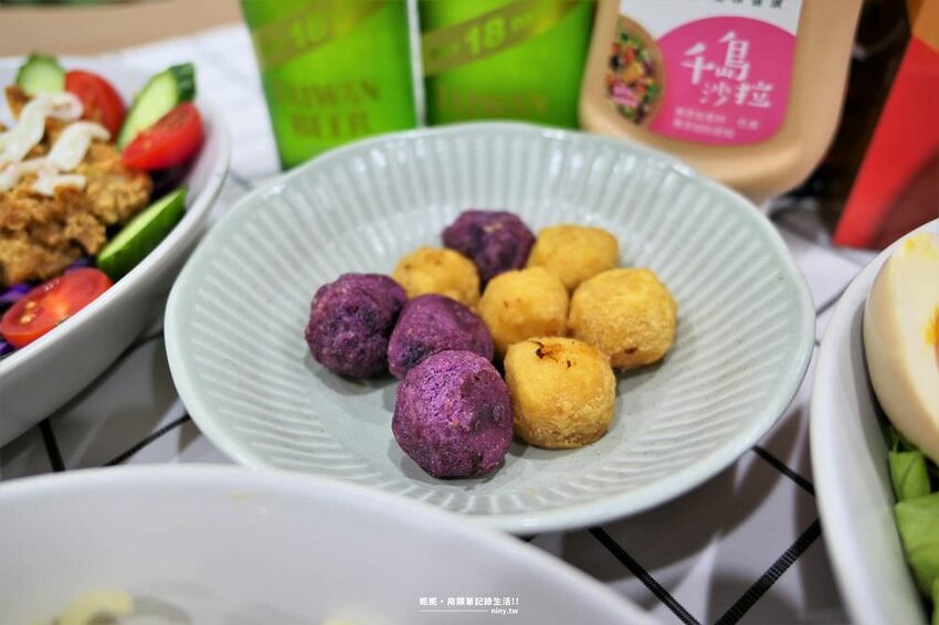 甜點就來份內餡爆滿的甜心地瓜球,使用氣炸鍋氣炸5分鐘就可以快速上桌(油炸也只要2分鐘),黃色的地瓜球包裹香甜的芋泥,紫色的地瓜球則是包裹著鬆軟的地瓜泥,雙色內餡吃起來也很有驚喜感。
