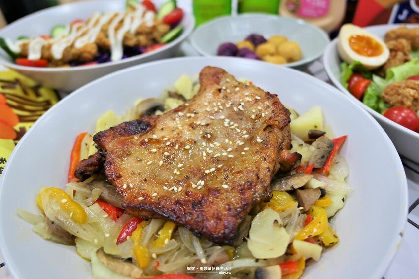 義式風味烤雞腿排是這次的品項中最喜歡的一款,這款我除了使用過氣炸鍋料理也另外使用過烤箱調理,使用氣炸鍋的話可先將皮面向下以溫度180度氣炸8分鐘,再翻面調至200度氣炸3~4分鐘即可享用;烤箱的話則可上下開火200度,加熱15~20分鐘即可,不論哪種出來的成果都是香烤後多汁的美味,尤其使用氣炸鍋調理後更能吃出外皮烤的酥脆的口感,使用整支的去骨大腿肉吃起來肉質相當軟嫩,義式風味吃起來有點兒微微辣,但也可能是因為有點微辣的味道,吃起來不會太膩,不論單吃或是像我們一樣搭配炒過的洋蔥洋菇等也都是不錯的選擇。