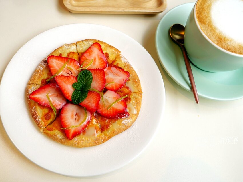 鮮豔草莓當季就是新鮮,淋上煉乳堪稱是絕配,餅皮Q彈有嚼性,擺盤視覺效果強、賣相佳。