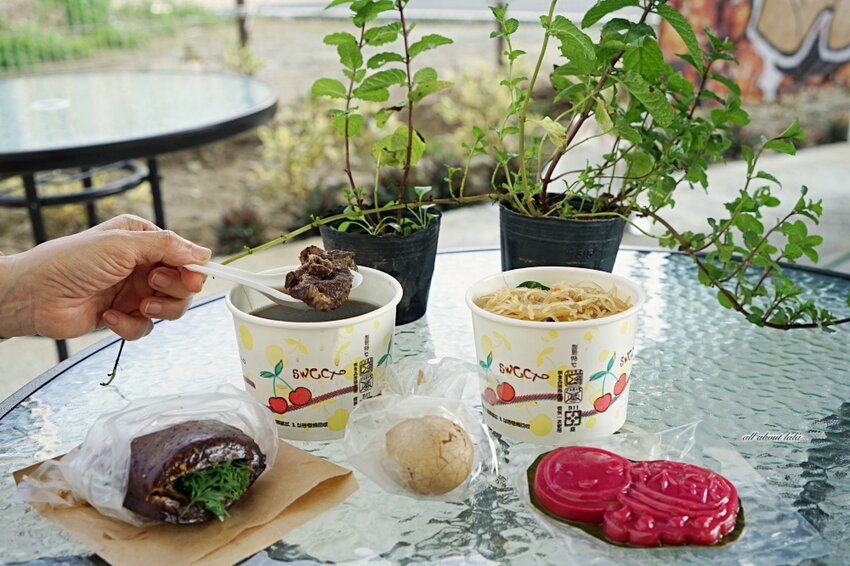 鹿茸藥膳湯(50元)、夾心豆乾(40元)、鹿茸藥膳蛋(25元)、炒米粉(忘了)、紅龍果福龜粿(50元)。背後那兩盆薄荷是現場打卡贈送的,有鼠尾草、百里香、迷迭香、薄荷可以任選,一個帳號可以兌換一盆喔!