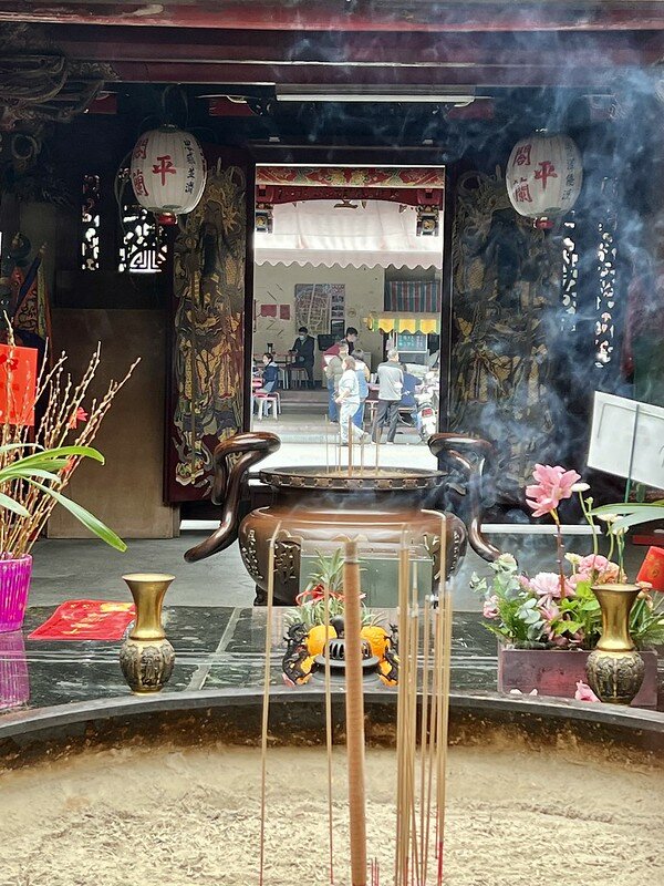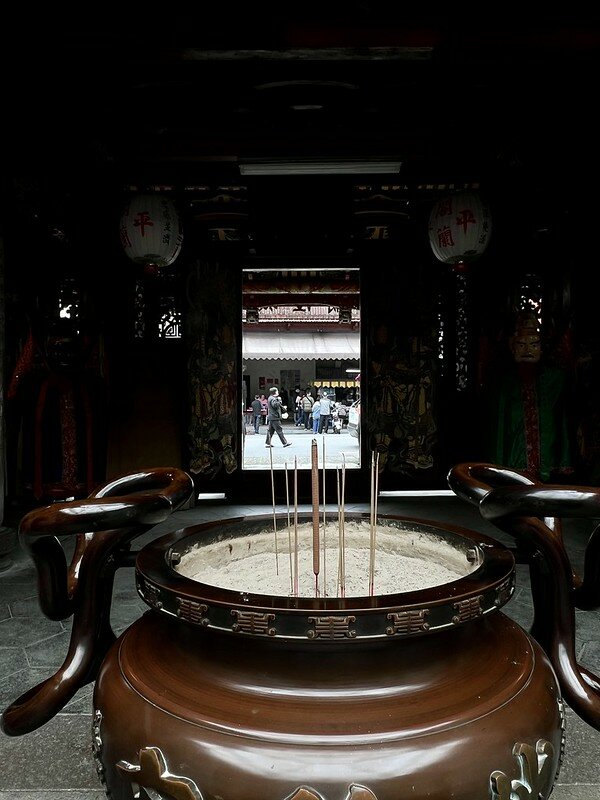 透過香爐看著這間切仔麵店覺得生活感十足