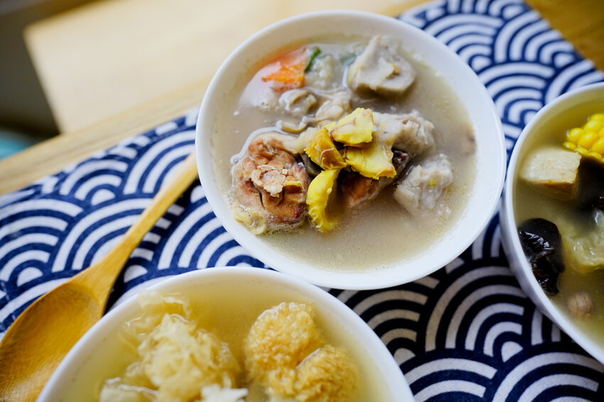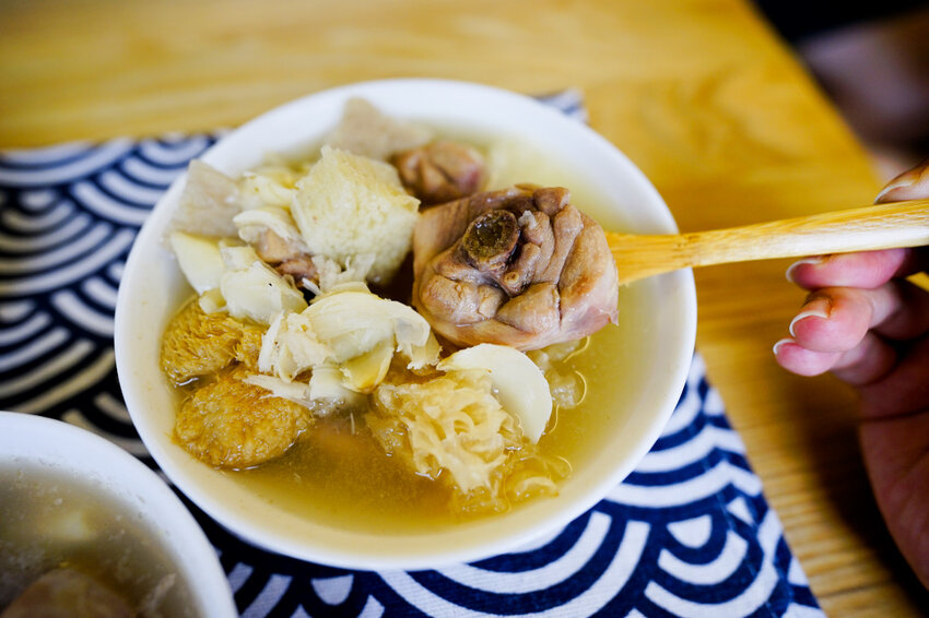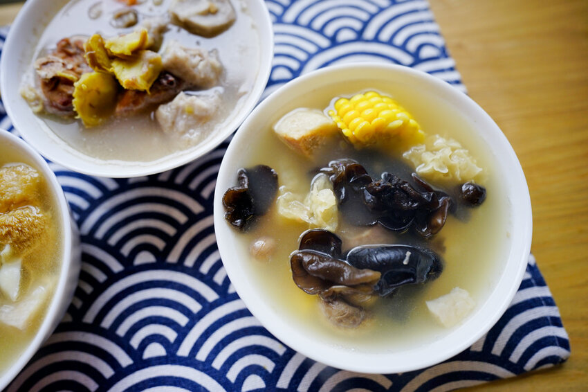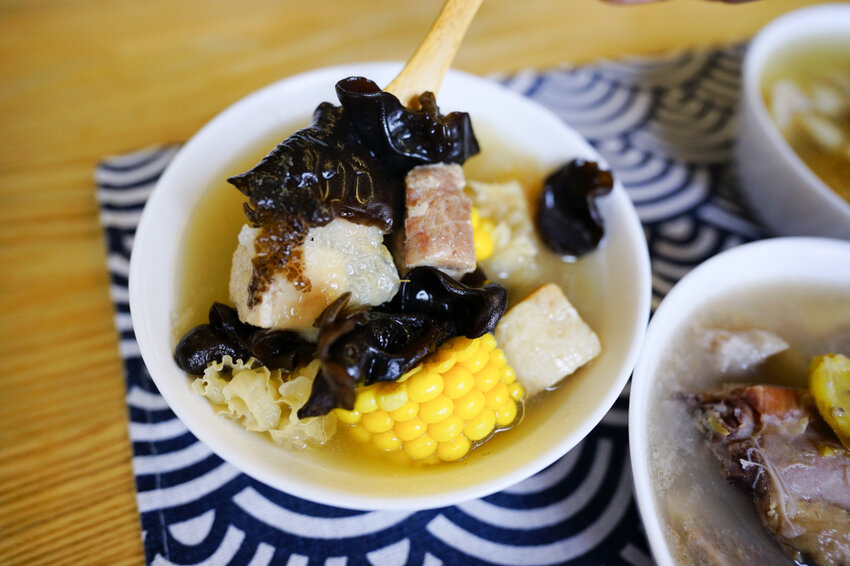 以雞高湯為底,再加上軟嫩的豬腩排,都是常見的食材像是黑木耳、白木耳、花生、蘑菇、玉米,我平常不喜歡煮在甜湯的白木耳,但這養生湯品裡的白木耳接受度卻很高,湯頭味道甘醇鮮美。