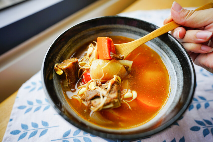 以雞高湯和牛高湯為基底,燉煮到軟嫩的牛腩,大量的番茄、洋蔥、紅蘿蔔、馬鈴薯,超清甜湯頭,連我女兒也很喜歡!