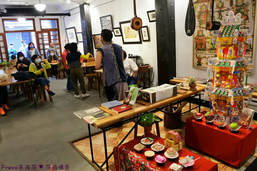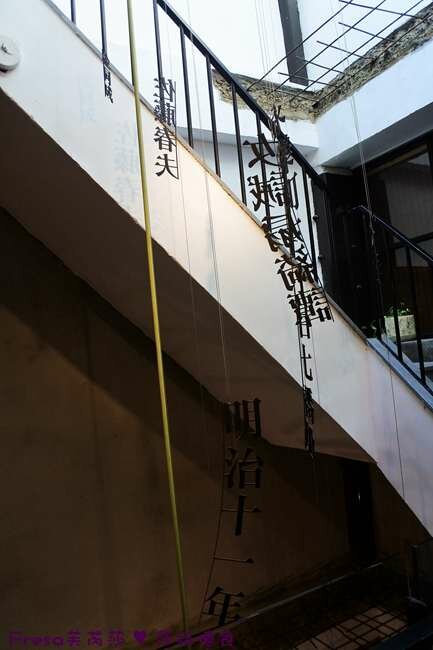 美美的天井灑落自然光限,懸吊著與鼓茶樓、府城相關字詞.