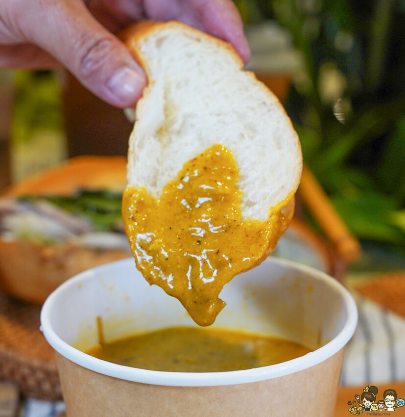 短棍麵包沾咖哩醬增加風味,咀嚼起來也更軟綿濕潤夠味