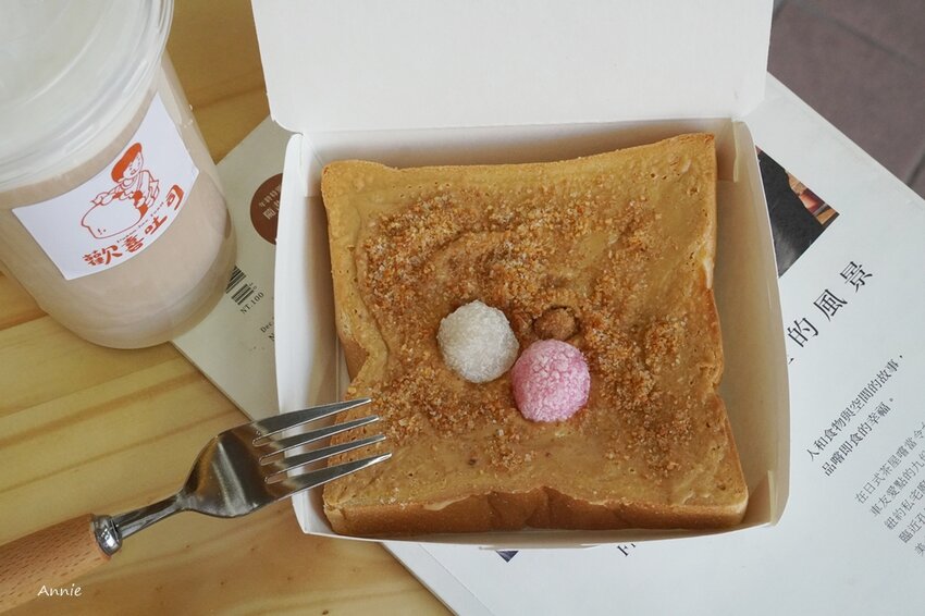 花生厚片吐司上面竟然還放了炸湯圓,模樣可愛外口感也很好吃,而且你們有發現嗎?厚片上面還撒上花生粉呢,這也太搞剛了吧,對於一個很愛吃花生粉的我而言超大加分,很多地方的厚片頂多塗上厚厚花生醬就很不錯了,花生粉我還是第一次看到。