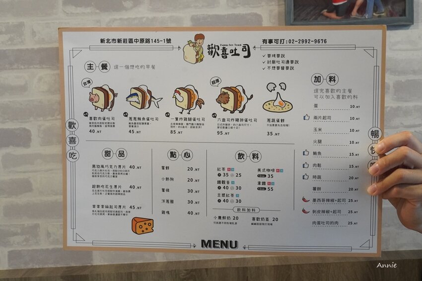 歡喜吐司主打吐司類,最便宜的肉蛋吐司僅僅40元,另外還有蛋餅,甜品(厚片吐司)、炸物小點以及加料選項,飲品類除了美式咖啡、紅茶、豆漿外,我也很推薦奶蓋系列, 一般早餐店飲料都不好喝,但歡喜吐司的飲品我覺得相當可以耶。