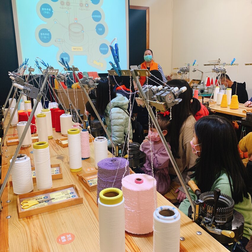 約可容納30組左右的親子一同上課,真的是不算小的空間,而且每個位置都有專業的手搖織襪機,超新奇的!