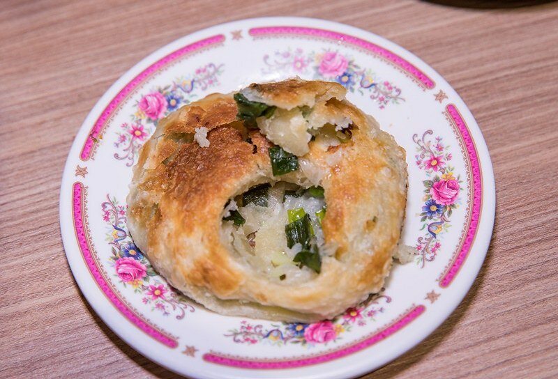 再看基隆蔥油餅是渾圓約成人手心大小,因為先煎後烤所以相對不油,且酥中透著微脆的口感,咀嚼端麵餅的滋味也和上述三地天差地別。