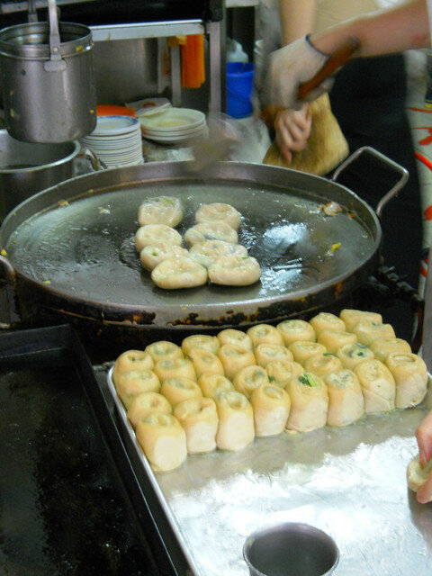 基隆的蔥油餅首先做法就不太一樣,麵糰捍成長條狀,中間灑入蔥花再捲成圓柱型,接著略為壓扁先油煎兩面酥香。