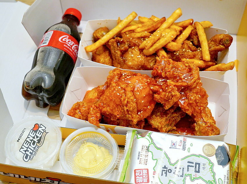 ▼NENE炸雞是四間必吃韓式炸雞的推薦名單之一,也是我們去韓國第一晚飯店訂外送吃到的炸雞,記得當初點的是醬料+起司口味,兩種口味都還不錯吃,也有可能是第一次吃正統韓式炸雞所以有驚豔到;價位約台幣532元,免外送費,還附有曲線瓶可樂、大盒醃蘿蔔,算起來CP值頗高! (下圖是我們去韓國吃到的版本)