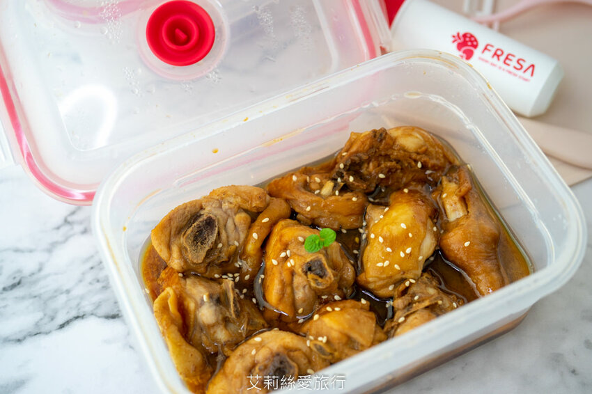 FRESA抽真空微波保鮮盒也很適合醃漬食材,像是要做排骨、三杯雞可以先把肉加醬汁真空醃漬放冷藏,食材短時間內快速入味,非常省時。