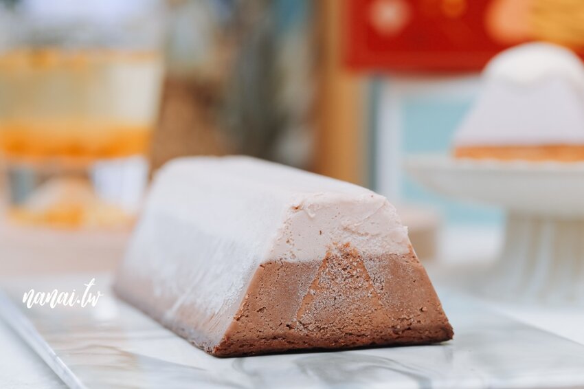 香蕉與巧克力結合迸出新滋味!一開始以為是爆濃的苦甜巧克力味,沒想到嚐鮮後大受好評,詢問店家後才知道,原來是新年期間推出新產品,以經典獨家山形內餡設計理念延伸,使用微苦微甜法芙娜可可蛋糕體、內餡外圓太妃奶醬、山尖巧妙運用法芙娜巧克力、山底則是用了我最愛香蕉牛奶餡,首先嚐嚐冷凍吃法,輕輕咬一口,紮實軟綿蛋糕體,有著法芙娜可可苦甜味,咀嚼第二口時山形內餡,香甜香蕉牛奶味,搭著苦甜法芙娜巧克力,兩者交錯互不搶戲,緊接著後韻太妃奶醬甜度表現畫龍點睛,每層內餡在口腔碰撞擦出美妙滋味,吃到最後一片都不剩呀!