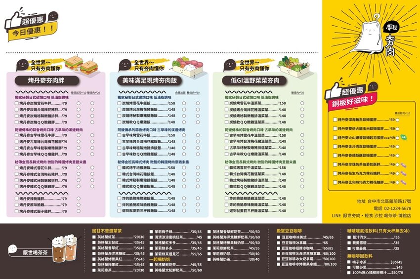 話說厭世夯肉的菜單供應的餐點品項其實蠻多的,除了有以丹麥吐司熱壓而成的夯肉胖、現烤的夯肉飯及低GI溫野菜餐盒之外,當然也有很系列的飲料做搭配。而且最重要的還有小資族最愛的銅板價餐點哦!