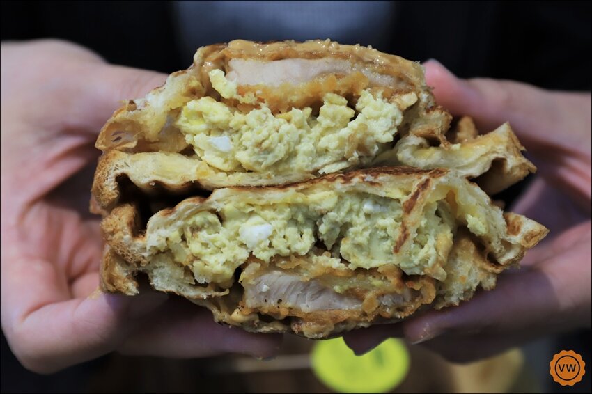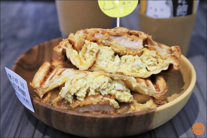 這款也相當好吃哦~有丹麥吐司先抹上一層花生醬之後,再放上一層厚厚的炒蛋,而最吸睛的就是那個夾在裡面,炸到酥脆又鮮嫩多汁的雞排!