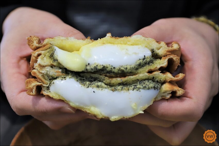 這款熱壓丹麥吐司是先塗上厚厚一層的伯爵奶茶及伯爵茶粉製作而成的抹醬,再夾上QQ口感的白玉麻糬之後熱壓而成。