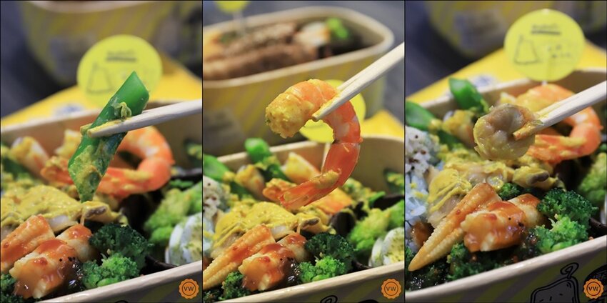 而這道也有使用多種當令的新鮮蔬菜以汆燙的方式進行料理,更能幫客人控制油份的攝取,像是綠花椰,玉米筍,綠蘆筍;至於海鮮的部份則是除了有去殼的蛤蜊肉之外,還有每日精挑細選的大蝦,先川燙後剝殼,吃的到新鮮彈牙的肉質之外,還有淋上店家自製的咖哩優格醬,好吃又爽口!