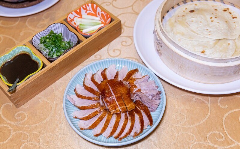 京式片皮鴨兩吃,這裡的烤鴨比較接近我在中國吃到的,鴨皮不那麼的油膩,也沒強調過度的酥脆,鴨肉本身粉紅細膩,倒有幾份像是鵝肉,甜麵醬、蔥絲的吃法基本上也差不多,倒是麵皮較厚一點,吃起來存在感強上一些。