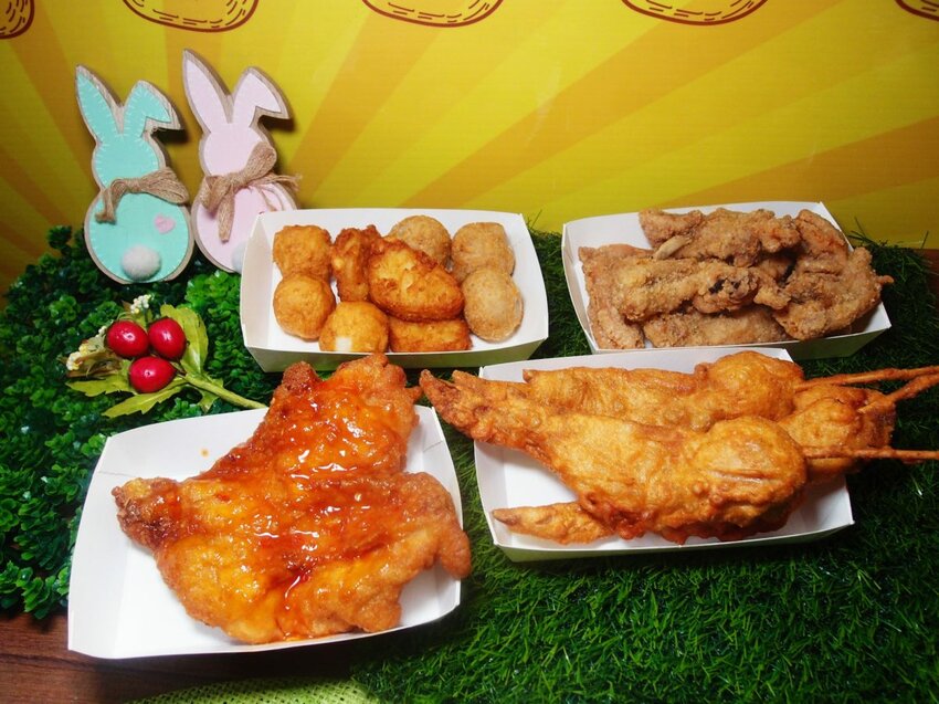 最後不免俗地要來張炸雞餐點大合照,包括泰式雞腿排,三節翅,三角骨和花枝丸,薯餅及蛋黃芋丸
