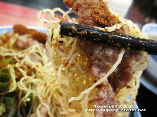 蝦籽牛肉撈麵(這是他們家的招牌撈麵。牛肉煮好後跟撈麵放一起。蝦籽就是蝦卵,先炒香呈棗紅色狀,然後大把大把的鋪在牛肉跟撈麵上)
