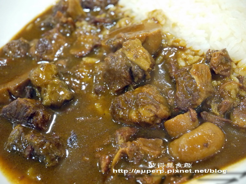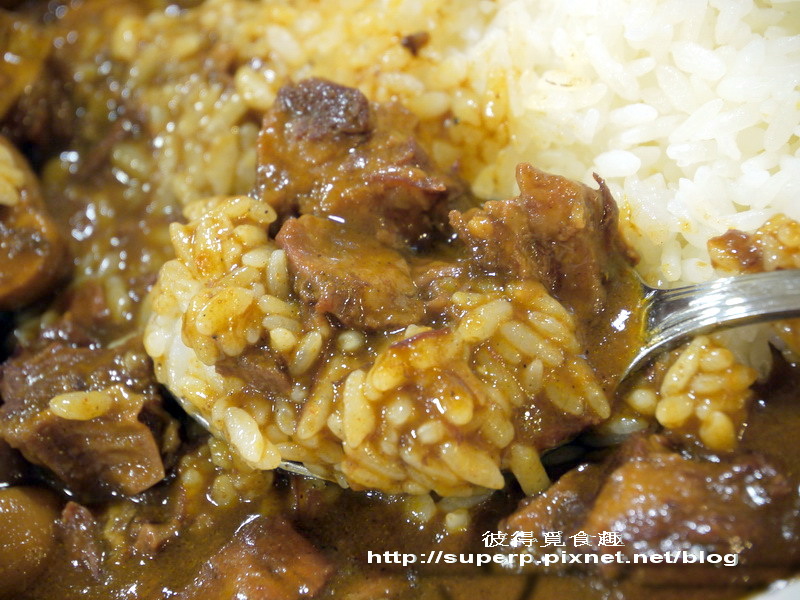 牛腩咖哩飯$150(咖哩的顏色深沉,吃起來鹹香中帶些微辣,有種日本咖哩和印度咖哩混血的感覺。很喜歡這種味道,因為一點都不單調,絕對不是拿市售咖哩塊來搪塞的,層次感很夠,超級下飯的!牛腩很軟,還不錯。我有位刁嘴的同事前陣子隨便買了附近的台式咖哩飯,結果被其味道給嚇到。介紹她去外帶這牛腩咖哩,她一吃馬上說”這才是咖哩嘛!”,還說已經有類似茄子咖哩那類的水準了,但卻是美食街的價位,反正是大推!)