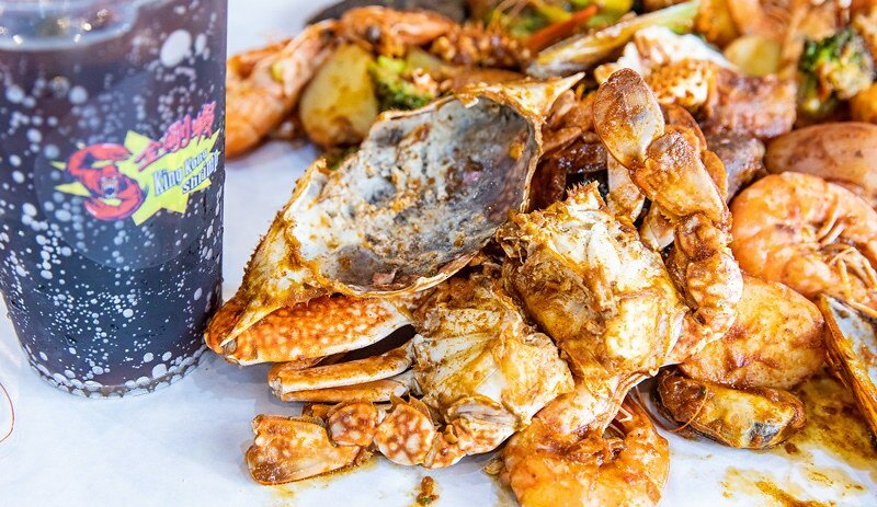 除了祕製醬料的手抓海鮮外,還有奶油玉米、薯條、檸檬雞翅、麵包和兩瓶飲料,還提供圍巾和塑膠透明手套。