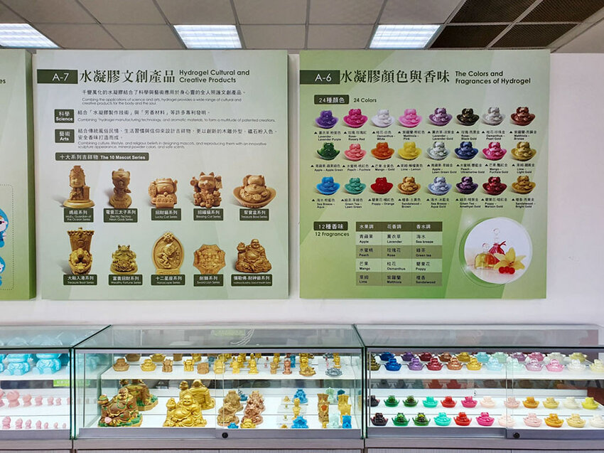 台南觀光工廠超多,一定要全部玩一輪才過癮,位於仁德的虹泰水凝膠世界,是全國第一座以水凝膠為主題的觀光工廠喔!備有大停車場超方便,其實水凝膠在生活中很常見,像是芳香劑裡面的果凍、冷熱敷包、低週波貼片等大量應用於醫療與生技,門票100元可以抵消費或是體驗DIY,因為導覽非常有趣,菓子跟M先生都覺得很物超所值