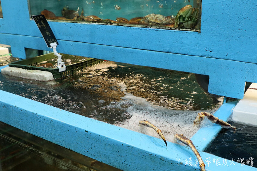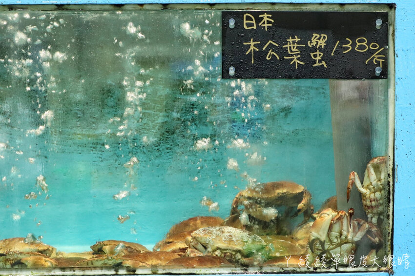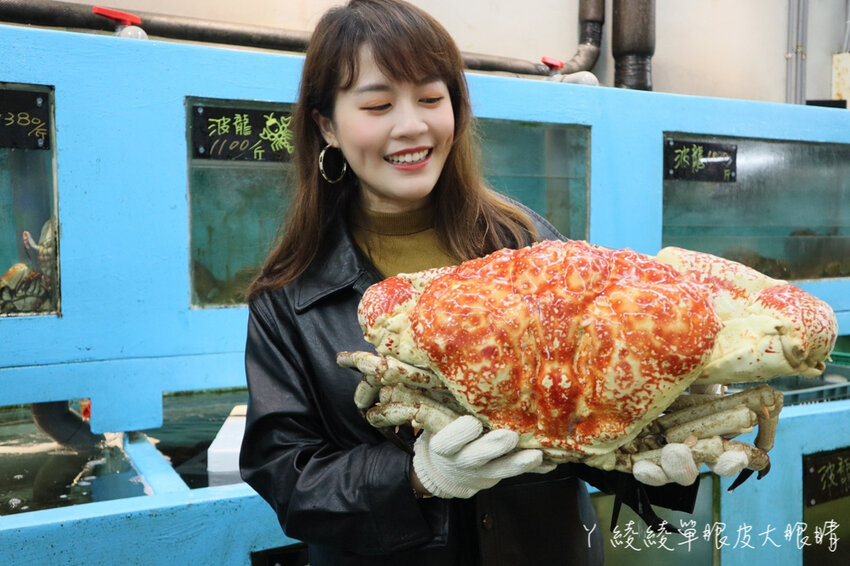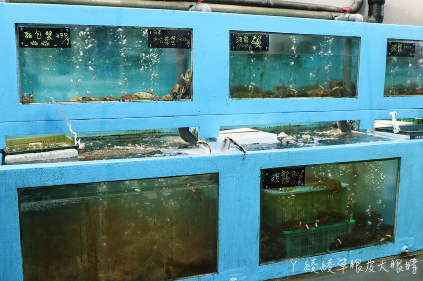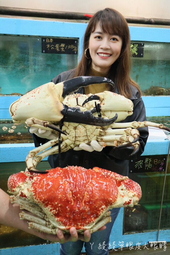 那天ㄚ綾綾來店裡看,有麵包蟹$399/斤、黃金蟹$600/斤、波斯頓龍蝦$730/斤、水姑娘$1380/斤、玉龍$1380/斤等等,另外還有鱈場蟹、日本松葉蟹、波龍等活體海鮮,大小隻的價格各不同,實際價格以每天店家公告的價位為主喔!
