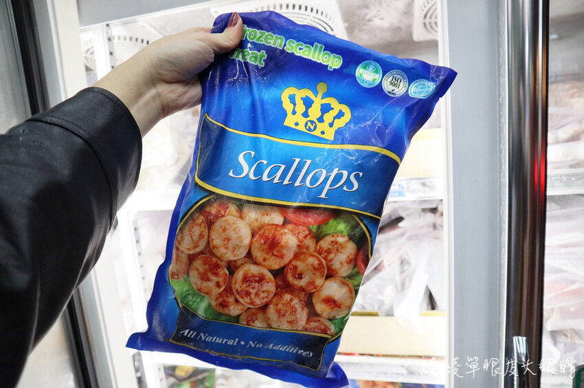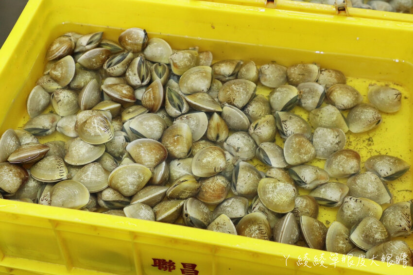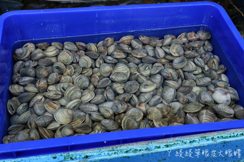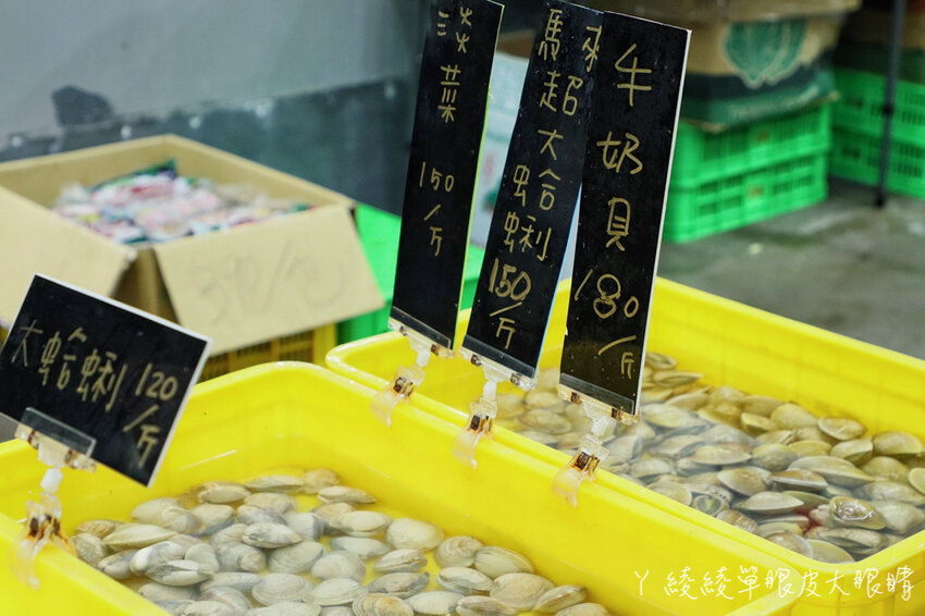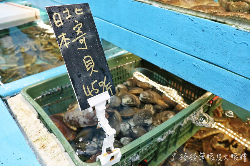 除了大型活海鮮之外,現場還有販售眾多漁獲跟貝類,像是天使貝、牛奶貝、馬來超大蛤蜊、日本北寄貝、日本活扇貝跟淡菜等等。
