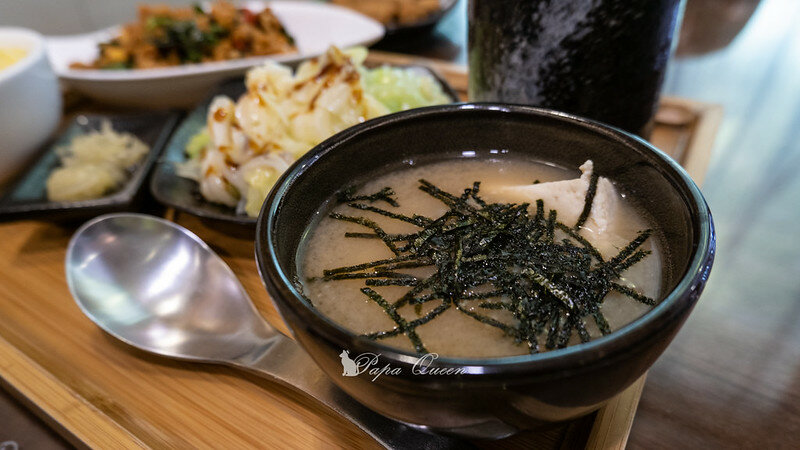 湯品-味噌湯很濃郁,選用的豆腐(大塊)應該是招牌版上寫的鹽滷豆腐!口感介於傳統板豆腐與百頁之間!