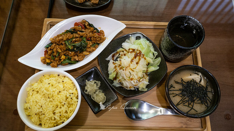 視覺配菜是賞心悅目的,打拋朱分量很足,高麗菜份量也是(簡單川燙後淋上醬油膏)一杯茶一碗味噌湯和一份老闆手作的開胃小菜