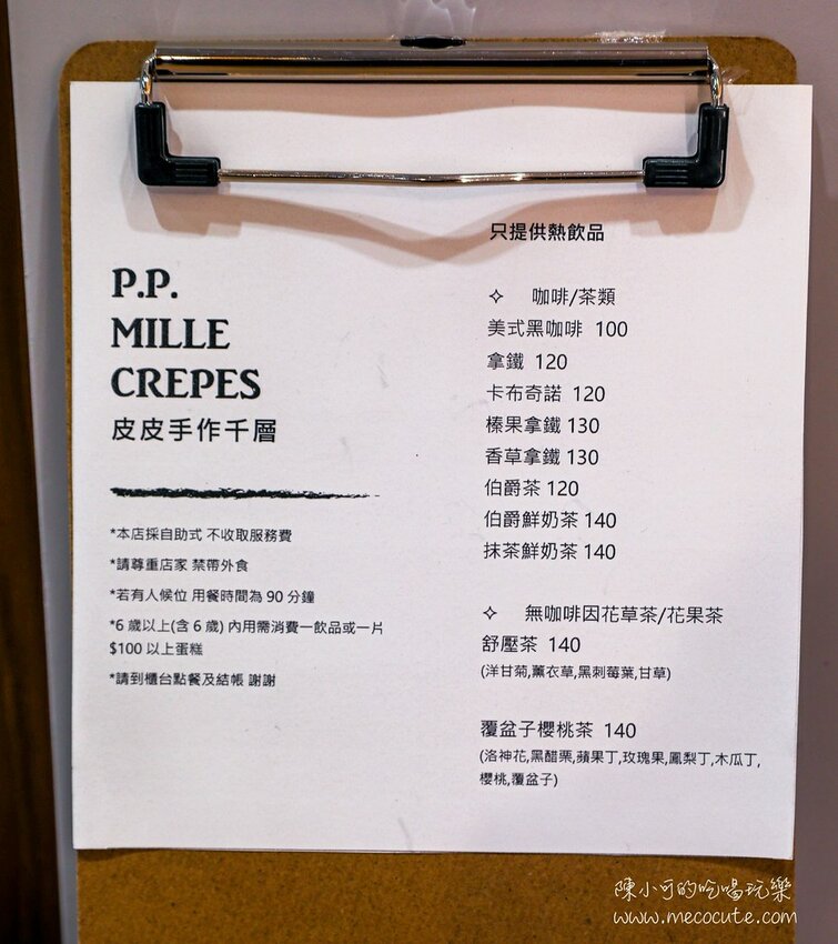 【皮皮手作千層蛋糕】內用飲品菜單,有咖啡、伯爵茶、奶茶和花草茶等,內用不收服務費。