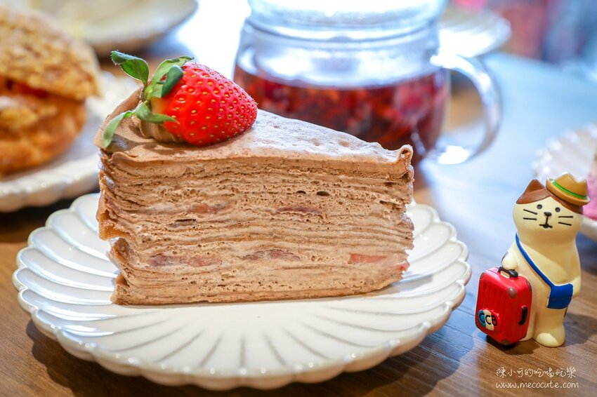 奶油平衡滑順,一層一層巧克力蛋皮柔軟,再加上可可奶油增加風味,裡面夾著草莓切片,酸甜滿載!
